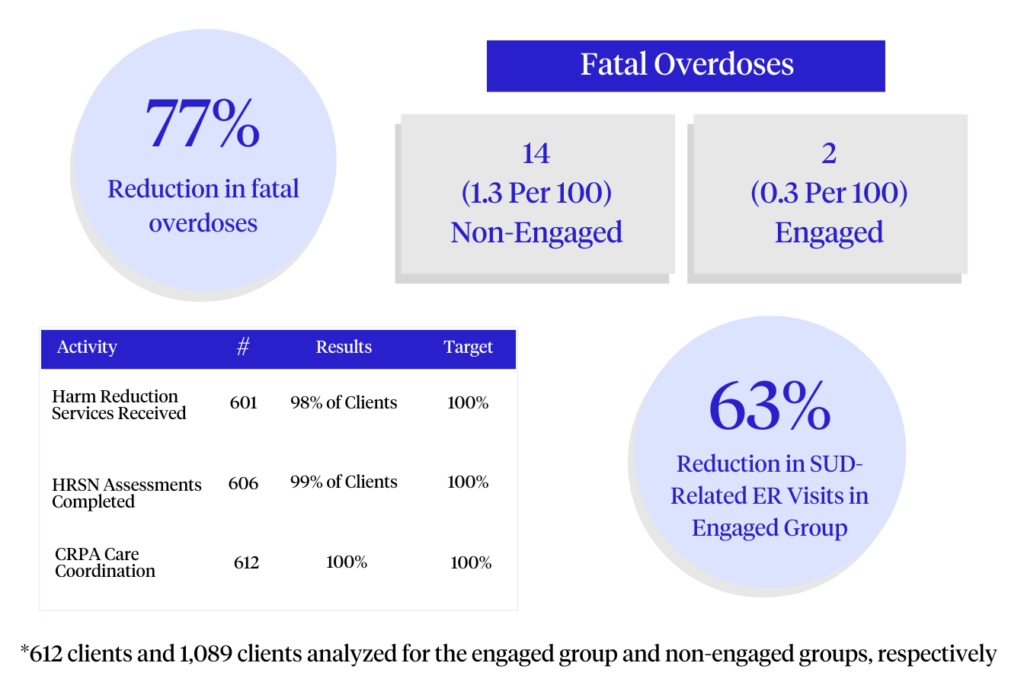 Although any program needs years of results to evaluate the full impact, these initial results suggest a strong impact of participation in the multiple levels of service that the program provides. Outcomes for these services include 100% of clients had a CRPA assigned to them at the initial point of engagement; from the prevention aspect, 84% of clients received harm reduction services (e.g., Narcan, an overdose reversal agent, screening for hepatitis, fentanyl test strips, and clean syringes); and from the social aspect, 91% completed screening for social care needs, with 78% of those needs met by community-based partners. The overall reduction of emergency room and inpatient care demonstrated that coordinated care can improve outcomes and ultimately impact the cost of care. A thorough analysis of visits that were specifically related to overdose and substance misuse showed that the engaged group had a reduction of 56.2% and 42.6% for ER and inpatient utilization, respectively.