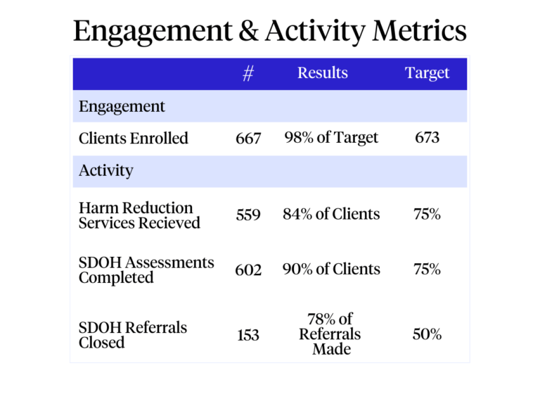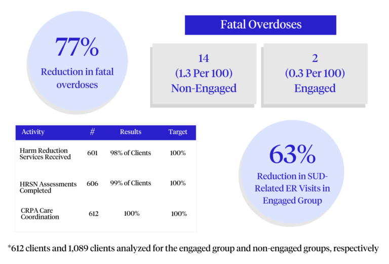 Upon identification of the high risk pool, the program places fully funded peer recovery advocates with participating treatment partners to deliver peer-led, person-centered services to at-risk individuals ‘where they are’ in a safe and collaborative manner. Dedicated teams will focus on preventing overdose harm, engaging individuals in recovery, delivering value to the health system, and addressing critical social determinants of health which impact health outcomes and lead to stressors that contribute to the initiation of an overdose, substance use disorder or relapse.